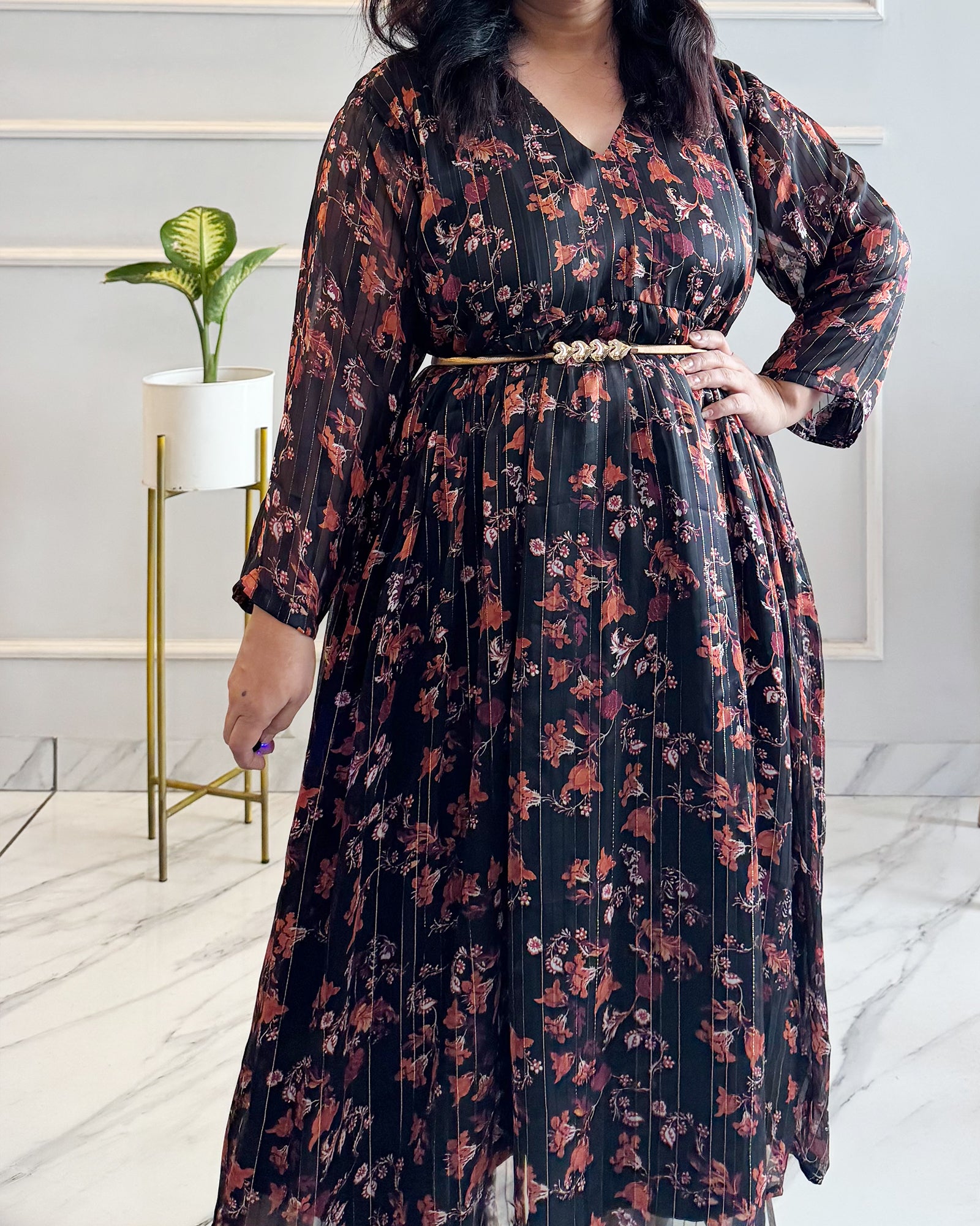 Make a striking entrance in this elegant black floral party wear dress, designed to blend timeless sophistication with a touch of playful charm